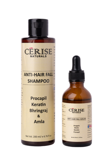 Hair fall treatment by Cerise Naturals combines anti hair fall serum and anti hair fall shampoo to control hair fall and make scalp health better and making hair follicles stronger at roots, shinier at tip.
