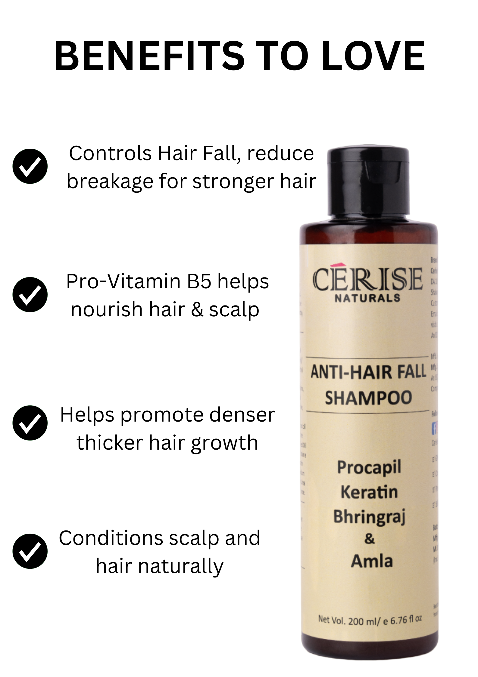 - Anti-Hair Fall Shampoo: An exclusive blend of essential ingredients that includes Procapil (hair supplement) for hair growth, Bhringraj (antioxidants & vitamins), Amla (antioxidants and vitamin C), Keratin (protein & natural conditoner), Pro-Vitamin B5 is fortified in this moisturizing shampoo for healthy hair growth.